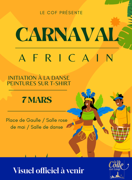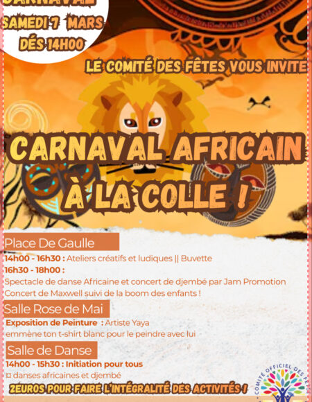 Carnaval africain, le 7 mars 2026 Sur la Place de Gaulle, salle rose de mai et la salle de danse Vous retrouverez : initiation à la danse africaine, peinture sur t-shirt et autres animations Le programme sera disponible prochainement
