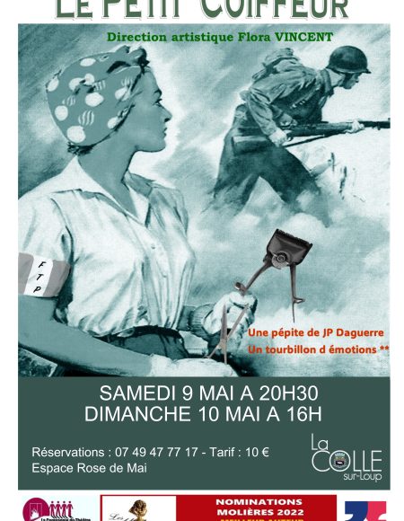 9 & 10 mai – Cie Entre Nous 🎭 Pièce : Le Petit Coiffeur de Jean-Philippe Daguerre 📝 Résumé : Juillet 1944, Chartres libérée de l’Occupation allemande. Chez les GIRAUT, résistants et coiffeurs de père en fils, tous les personnages sont chahutés par l’histoire. Une pièce sensible sur la vindicte populaire et les secrets de famille. 💰 Tarif : 10 € 📞 Réservations : 07 49 47 77 17 Salle Rose de Mai, rue Clémenceau, la Colle-sur-Loup.