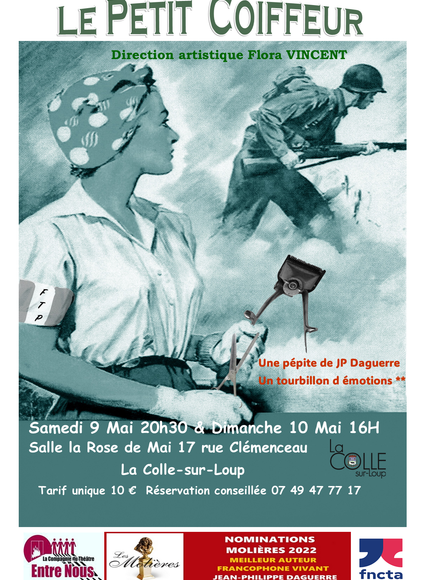 9 & 10 mai – Cie Entre Nous 🎭 Pièce : Le Petit Coiffeur de Jean-Philippe Daguerre 📝 Résumé : Juillet 1944, Chartres libérée de l’Occupation allemande. Chez les GIRAUT, résistants et coiffeurs de père en fils, tous les personnages sont chahutés par l’histoire. Une pièce sensible sur la vindicte populaire et les secrets de famille. 💰 Tarif : 10 € 📞 Réservations : 07 49 47 77 17 Salle Rose de Mai, rue Clémenceau, la Colle-sur-Loup.