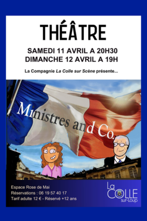 THÉÂTRE : « Ministres & Co » : Samedi 11 avril et dimanche 12 avril La compagnie colloise La Colle-sur-Scène vous invite à découvrir « Ministres & Co », une comédie satirique de Jean Bénassy qui plonge avec humour dans les coulisses du pouvoir.